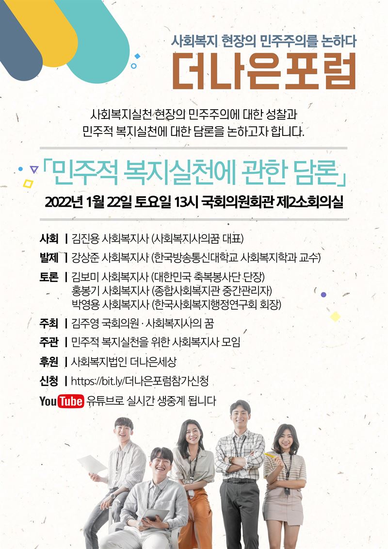 꿈꾸는 사회복지사들의 모임인 ‘사회복지사의꿈’(대표 김진용)이 김주영 국회의원과 공동주최로 1월 22일(토) 오후 1시에 국회의원회관에서 민주적 복지실천에 대해 논하는 담론의 장을 마련한다.
