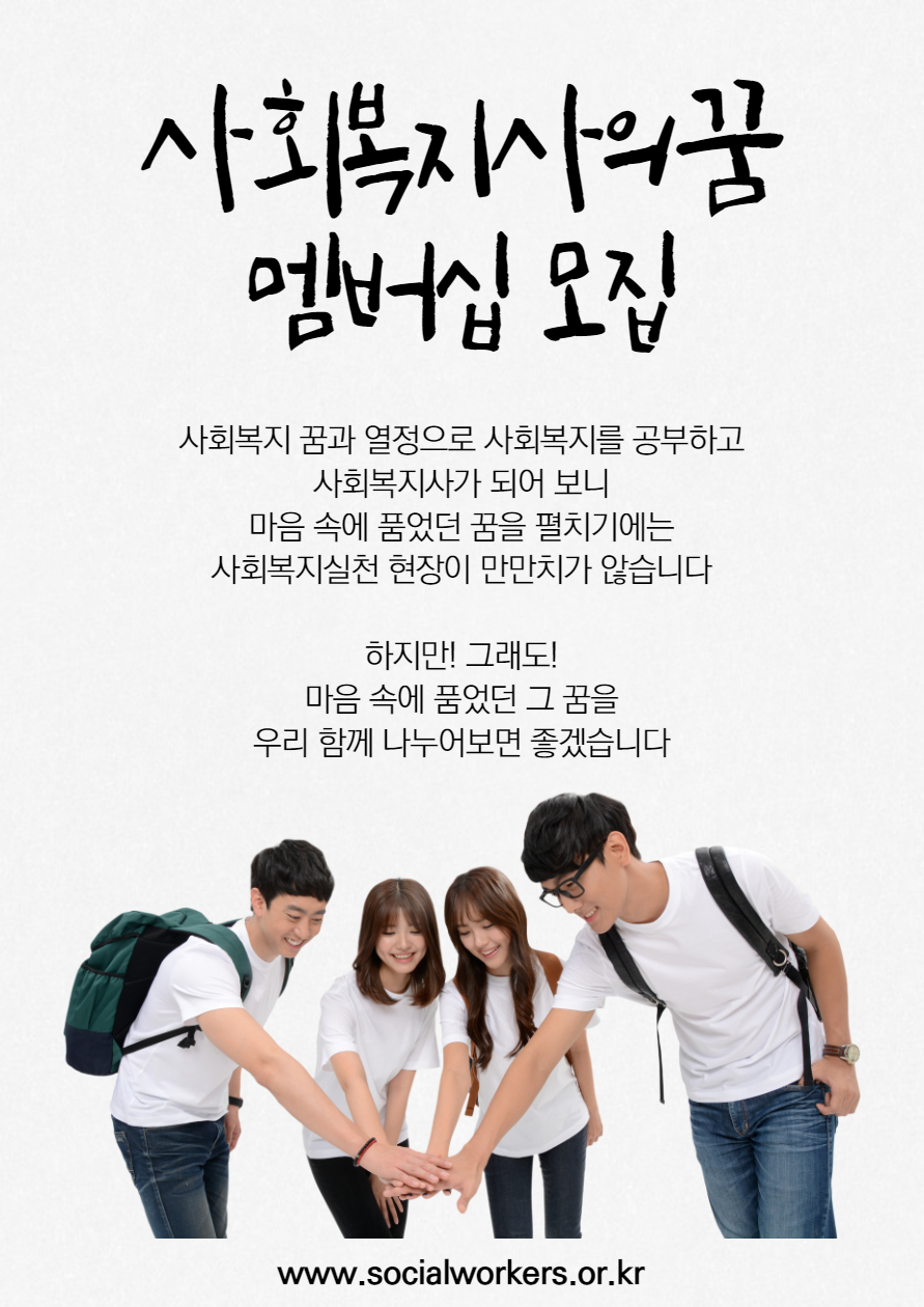 사회복지사 선배님, 후배님, 그리고 멋진 동료 사회복지사 여러분, 아래 링크를 클릭하여 주셔서, 사회복지사의 꿈 참여신청을 부탁드립니다. 꿈의 실현을 위해 함께 하겠습니다. 그리고 우리의 꿈 실현을 위해 함께 해 주시기를 부탁드립니다.