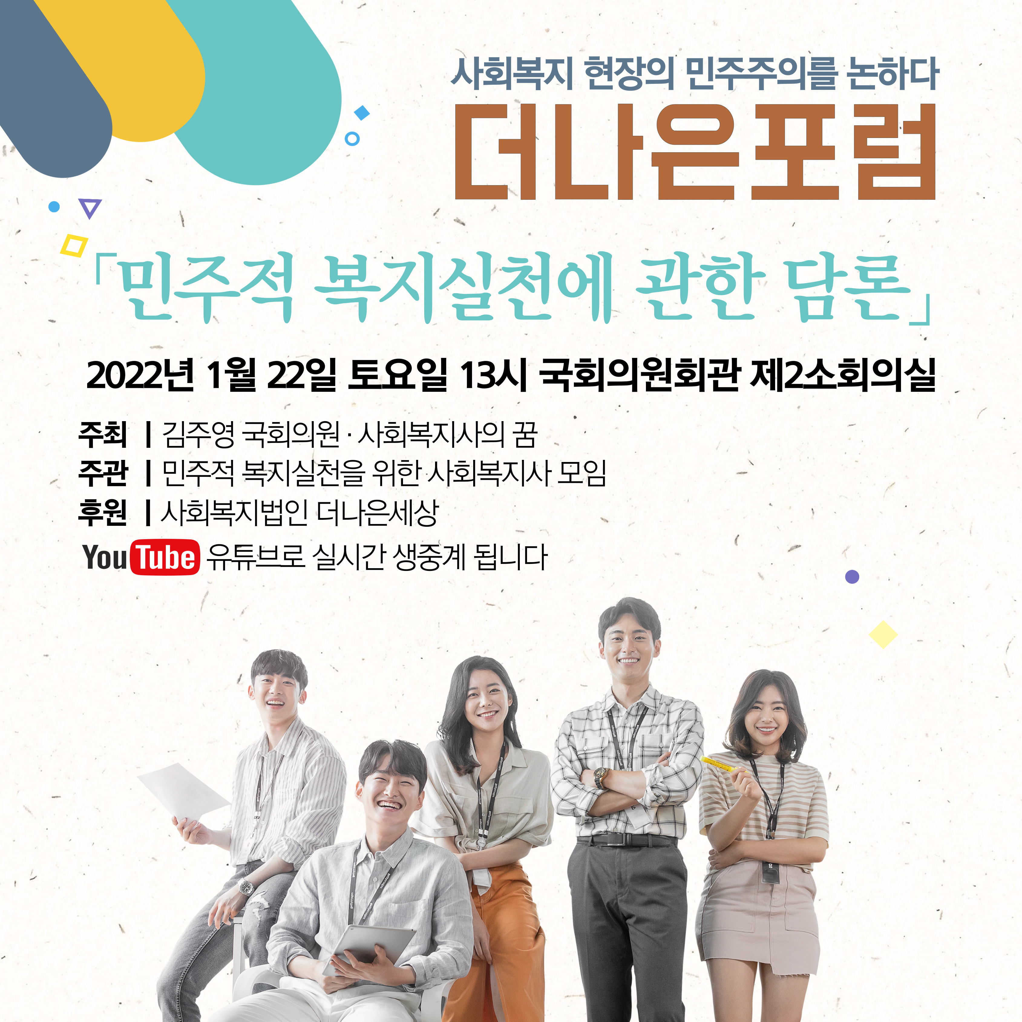 '김주영 국회의원'님과 '사회복지사의 꿈' 공동주최, '민주적 복지실천을 위한 사회복지사 모임' 주관, '사회복지법인 더나은세상' 후원으로 「민주적 복지실천」에 관한 이야기를 나누는 자리를 마련하였습니다.